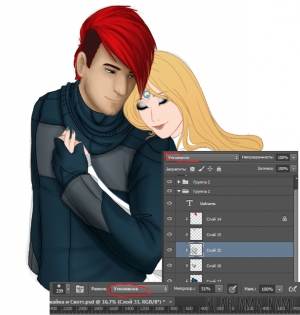 - Бывает, что нужно какую-то часть рисунка затемнить, сделать еще одну глобальную тень. В этом случае я просто использую новый слой с параметром "Умножение" и цветом, близким к серому, но в зависимости от всей картинки в целом с некоторыми оттенками. У меня для синей куртки я использую серо-синий цвет.